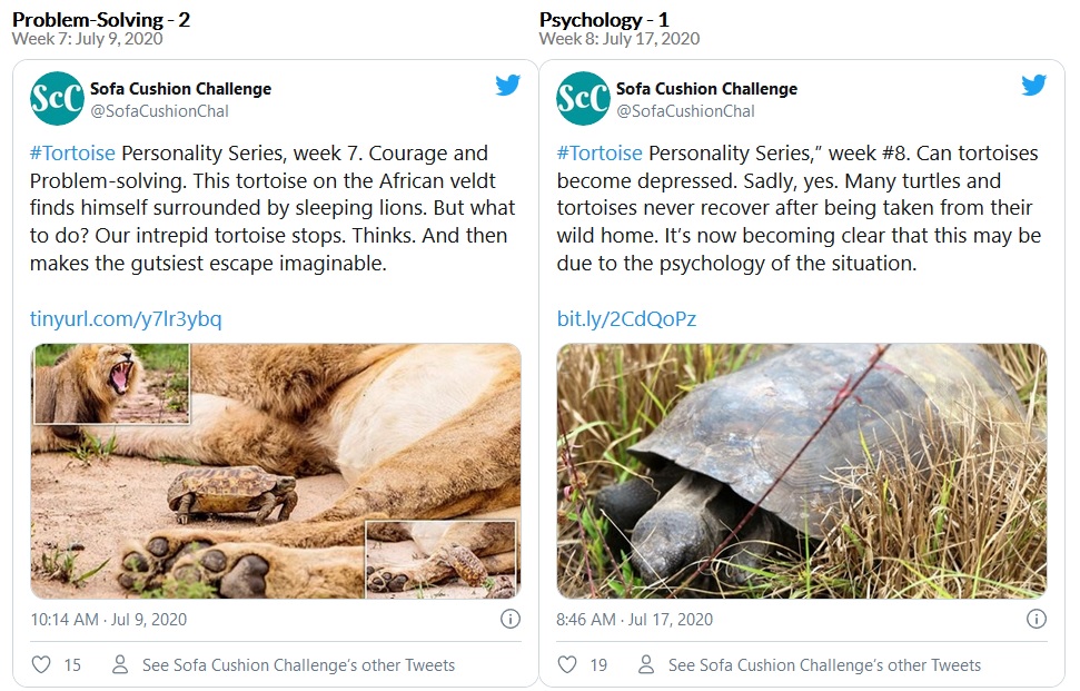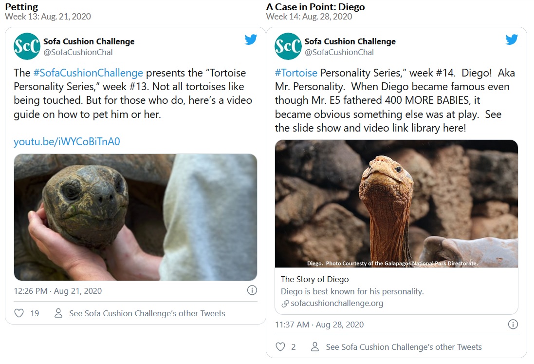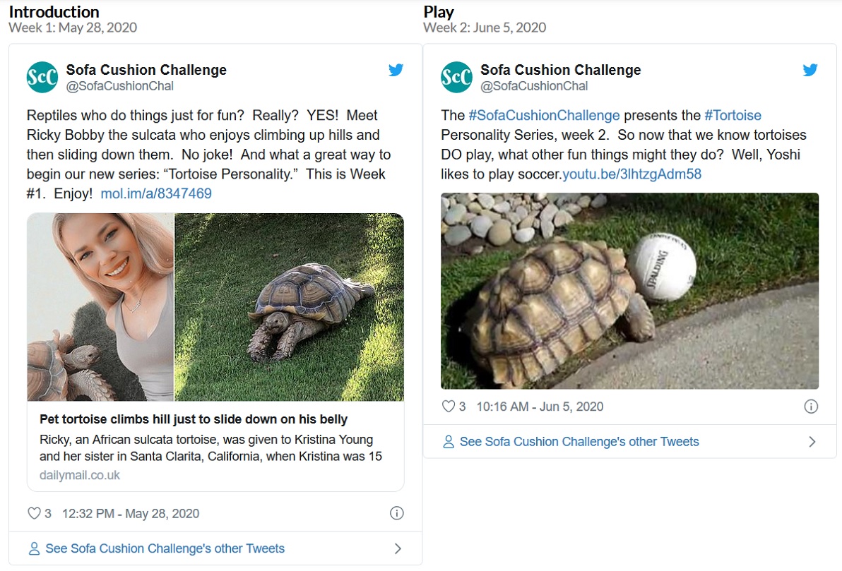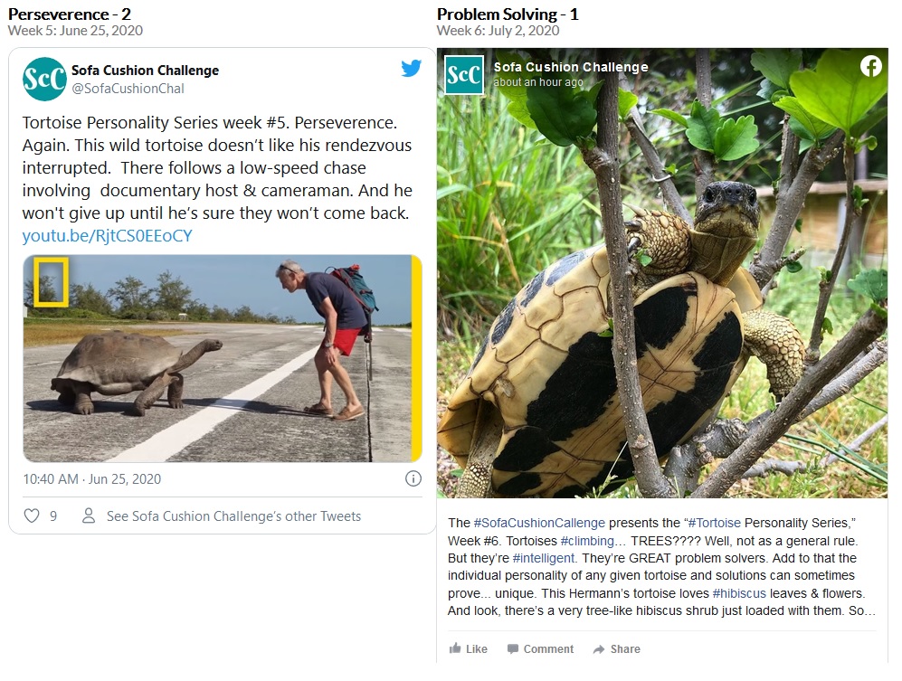 From May 28, 2020 through Sept. 4, 2020, the Sofa Cushion Challenge hosted the Tortoise Personality Series. Can reptiles really have distinct and individual personalities? Can they play? Can they become depressed? Each week there was a new post on social media dealing with these questions. You be the judge.